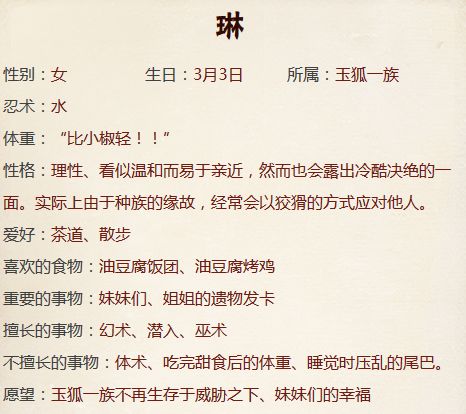 以下是忍3几位女角色的相关设定,周年庆的时候放出的啦。