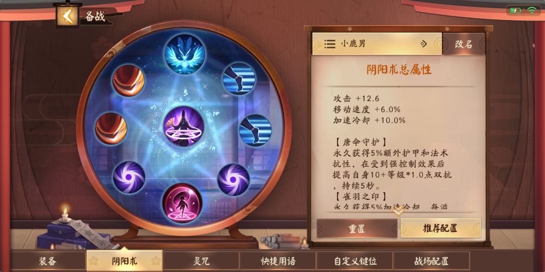 因为小鹿男的二技能很容易叠满言灵,所以这个就没有异议,唐伞守护可以增加站场能力,雀羽之印可以提高攻击力前提是出了很多CD装,其他除了移速必不可少之外,其他看个人情况选择,比如不会控蓝,就带上气和,或者前期想打出更多伤害可以选择生灭,想提高斩杀概率可以选择破灭。