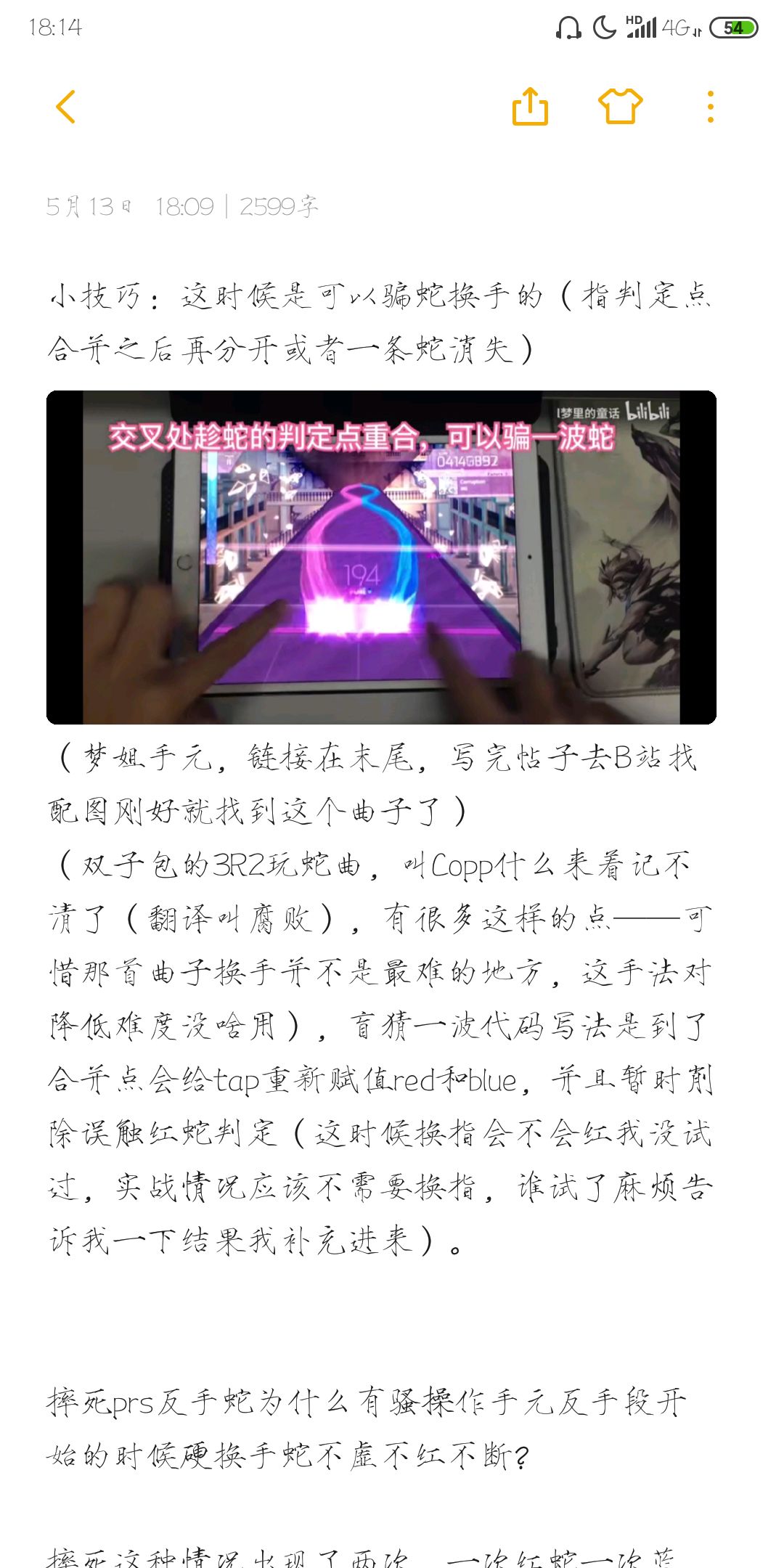 如果这时候你换一根指头接这条红蛇,同时前一根指头离开屏幕(或者可以是这根指头短暂地离开了屏幕),蛇会红一会提醒你指头不对(然而这时候仅有的补救方法就是继续用新指头莽,最多漏一两个,这时候慌乱换手就会漏更多),同时漏掉一两个判定点。因为判定了你前一个tap已经消失,蛇会给你新的tap(变量就叫tap吧)赋值tap=red,然后继续给它判定,这时候一般会漏掉一两个判定点; 如果你用另一个指头接这条红蛇,同时前一个指头没有离开屏幕(也可以是两手硬换不离屏幕)——那么恭喜,你将看到传说中的映日双蛇别样红,只要持续几秒你就会喜提TL(Hard模式)。这里应该是给red和blue定义了一个bool变量测算前一个tap还在不在屏幕上,实际上开头我写的定义只是方便观看,实际代码肯定要比这复杂的多(这句看不懂可以不看),这时候最好的补救措施就是迅速把tap a撤离屏幕,然后就会像上一自然段一样还能苟; 顺带一提,像我这种砸屏幕过分用力的手癖经常会因为砸一下弹起来又落下去导致红蛇,所以戒掉手癖从我做起(((