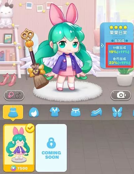想要分数?想要金币?还想要搭配好看?那么套装肯定就是喵粉们的最好选择!选择套装“果果日常”+“天使之羽”翅膀+“魔法扫帚”饰品,就能获得19%的分数加成和23%的金币加成啦!