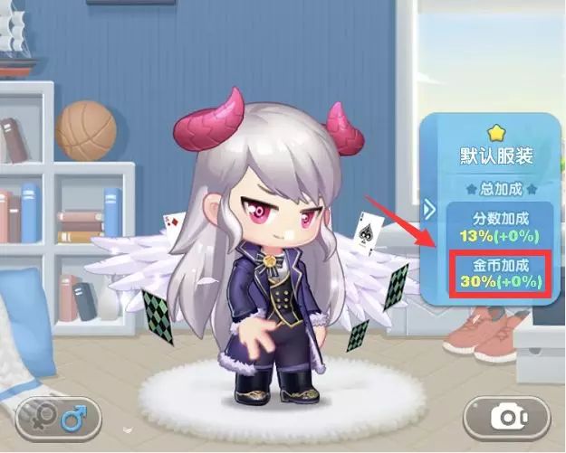 男生版金币最高加成搭配:魔王之角+暗夜礼服+魔王下装+暗夜贵族靴+“天使之羽”翅膀+“魔术扑克”配饰,合计获得30%的金币加成!