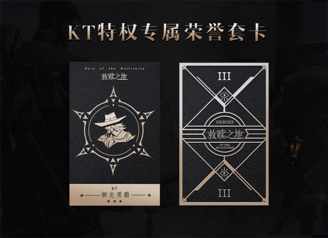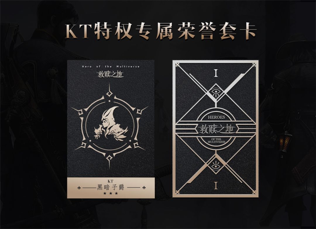 本套卡为KT全套收藏卡,全套由救赎专业设计师设计,正面印有救赎英雄头像及段位名称,背面印有《救赎之地》logo,每张卡对应不同的段位和英雄,只有参加KT计划并达到段位的玩家可获取,全套由金属材质制成,黑金配色彰显尊贵,极具收藏价值,目前全套正在监修中。