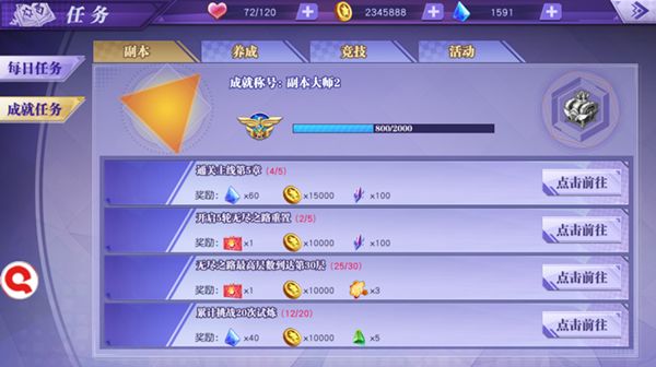 成就任务是玩家中在游戏中达成成就后,系统会给予奖励并给予称号。成就任务分有4个项目,副本成就、养成成就、竞技成就、活动成就。