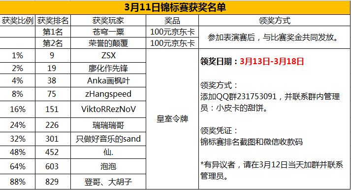 为了保证表演赛的顺畅进行,请获得锦标赛第1-3名的玩家,在比赛结束后及时添加QQ群:231753091,并联系群内管理员:小皮卡的甜饼。
