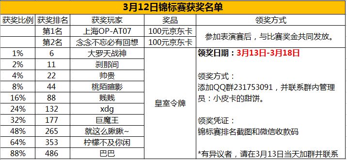 ☆ 排名在1%,2%,4%,8%,16%,24%,32%,48%、64%、88%的10位玩家也将获得皇室令牌1枚!
