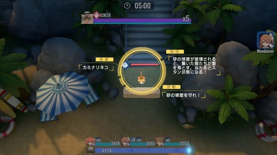 三JOKER轰顶:在boss血量低于一条时会释放,三只joker会回到场地中间对面前造成大范围攻击,并且会对我方造成眩晕效果,伤害较高请注意回避。
