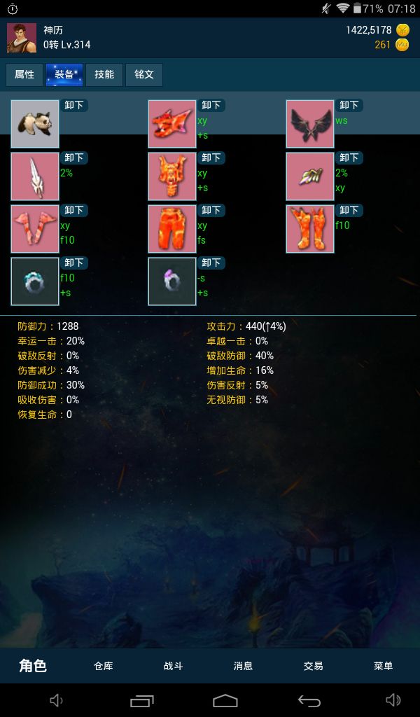 玩了大半月这进度还算可以,先介绍一下下面那个是我的小号,我的小号虽然废了但可以破茧成蝶也是不幸中的万幸。别小看这垃圾装备可以时时把控被攻击者的反伤数值调整最佳装备效果打倒对手,遇到双7绕道而行。时时把控也能玩转大佬?反伤流用来PK斗乐挺好的,打怪赚MU币的还是不要玩反伤。
