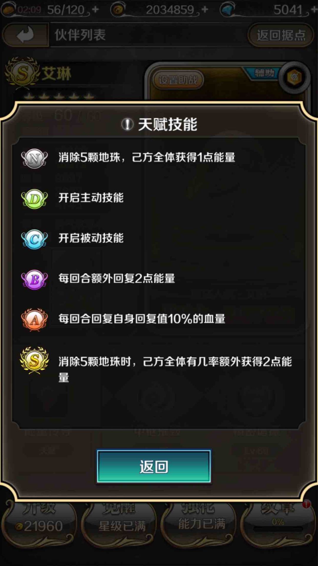 天赋的亮点在于给全体队友回能量,5颗地珠也是很低的要求,就算你是单人模式也是可以比较轻松的完成这个要求,而在天赋达到S以后,更是有几率额外回复2点能量,运气好的好消除5颗地珠后全队都可以减少3点能量,这个是极其强力的回能天赋,顺便提一下艾琳 水神 拉泽尔 哈尔迪可以组成目前回能最快的极速技能流队伍,我的战友Joker正准备制作这样一个战斗视屏供大家来欣赏,到时候各位可以去捧捧场。艾琳的被动技能减少能量上限,提高攻击力,最重要的一条,进入战斗后全体队友有几率减少3点能量上限,一旦触发了这个效果,就等于在这次副本里你的人物永久减少了3点能量上限,配合艾琳的天赋技能,这回能量的速度真是杠杠滴,要知道一般人物把被动技能升满60才是减少7点能量上限,而且这所需花费的技能书的数量是相当巨大的,而艾琳的一个被动技能就有几率减少3点,相当于额外增加了20级的被动技能,必须大赞一个。艾琳的主动技能也是在某些特定的副本里起到重要的作用,作为目前全人物里降低治疗效果最高的技能,在40红和50红的boss会回血的情况下,她的降低治疗可以大大缩短队伍打boss的时间,特别是50红本的boss吉利亚特,在没有降低其治疗的情况下每次回血都能回复30多万的血量,而一旦艾琳的主动技能释放后,给boss上了降低治疗的debuff,他就只能回复可怜的10多万血,等于队伍可以少打了20万的血呢,再配上此技能还会让怪物中毒,中毒的掉血量也是和怪物的回复值有关,回复值越高的怪物每回合掉血越多,相信对于今后以回复擅长的boss也会是一个不小的打击。