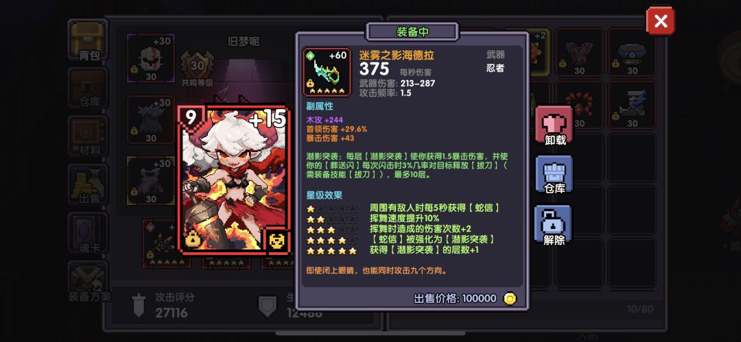 下图因为测试木武的伤害强度,我选择使用了3爆伤的魂卡。(30%的概率触发拔刀)