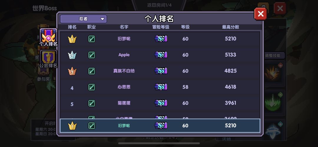 因为很多小伙伴不相信我说是运气好,拿到了第一,所以就贴出来我们区的分数排名。我们区的忍者实力真的都挺强的。真的是运气好,第一次打这个有点头晕,因为限制了时间,晚上8点-9点。当时打的时候就是世界boss的第二阶段了,真的是把我这个小短腿忍者,腿都跑酸了~ 在之后后面如果有机会的话,会更新一篇忍者对于世界boss的攻略,如果有机会的和时间的话。