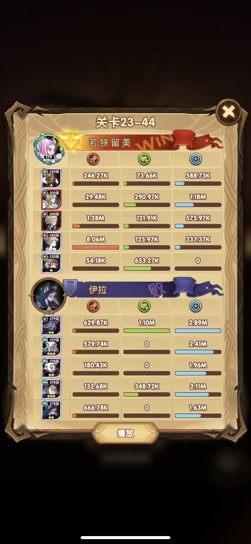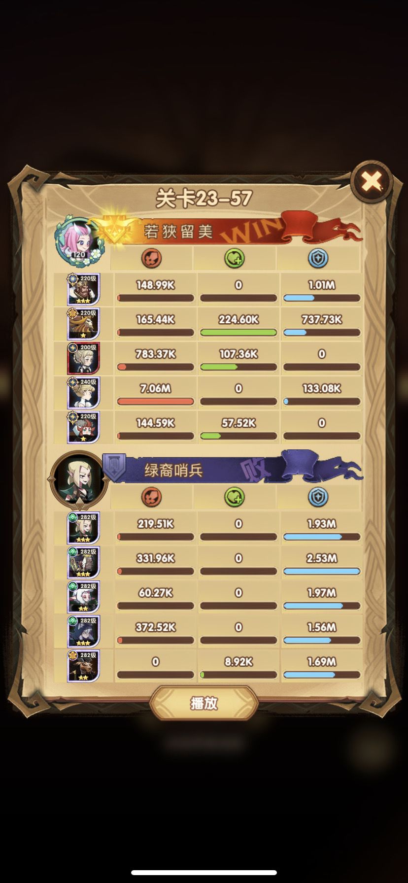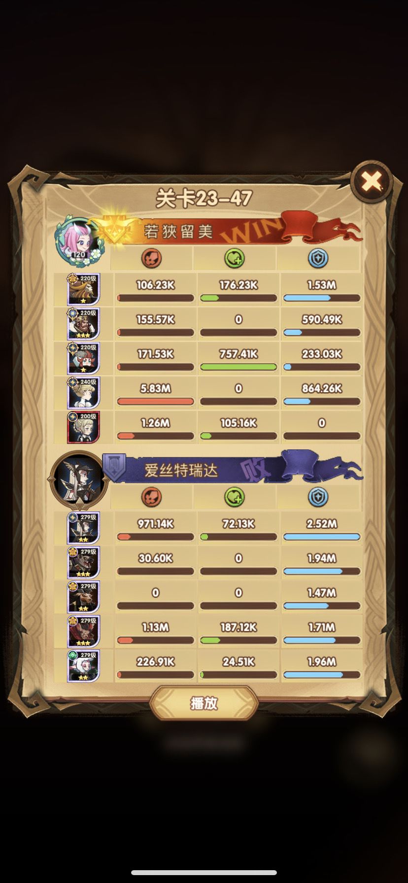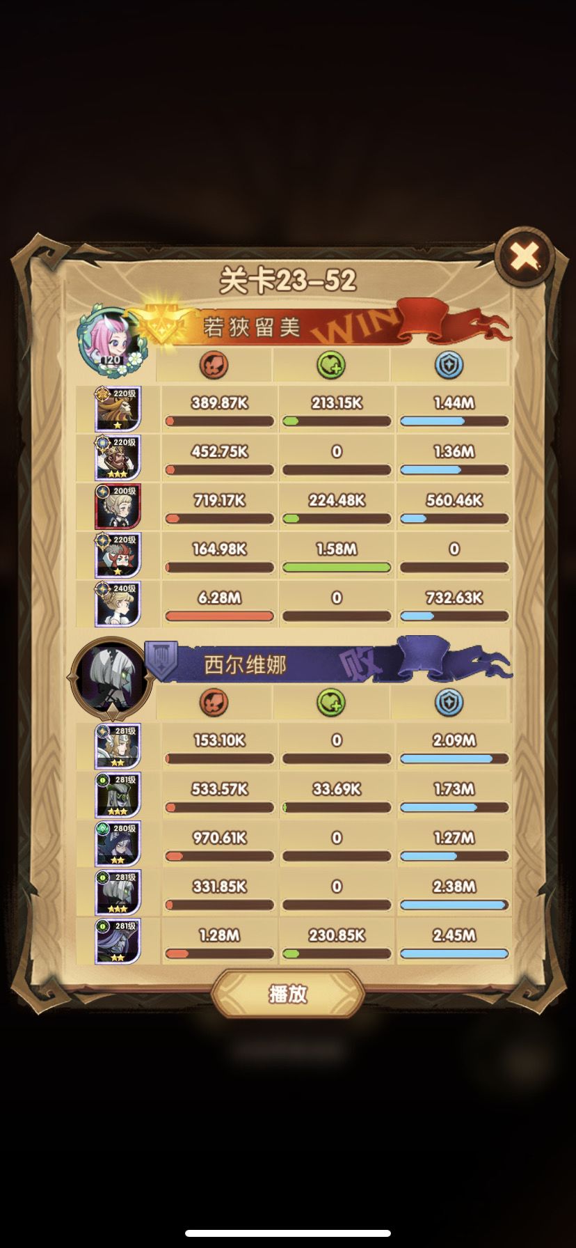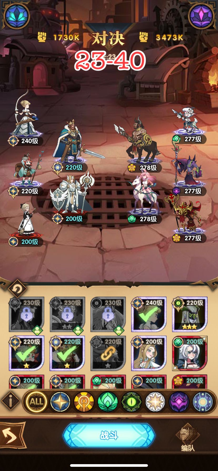 等级的话就是龙弓240+两个220+两个200,正常到23章应该都差不多是这个等级。亚瑟一开始绑的狮子🦁️,但是后来发现有些关没狮子扛不住,就绑了女妖。现在为了高阶竞技场能多挣几个币,改成了光女。