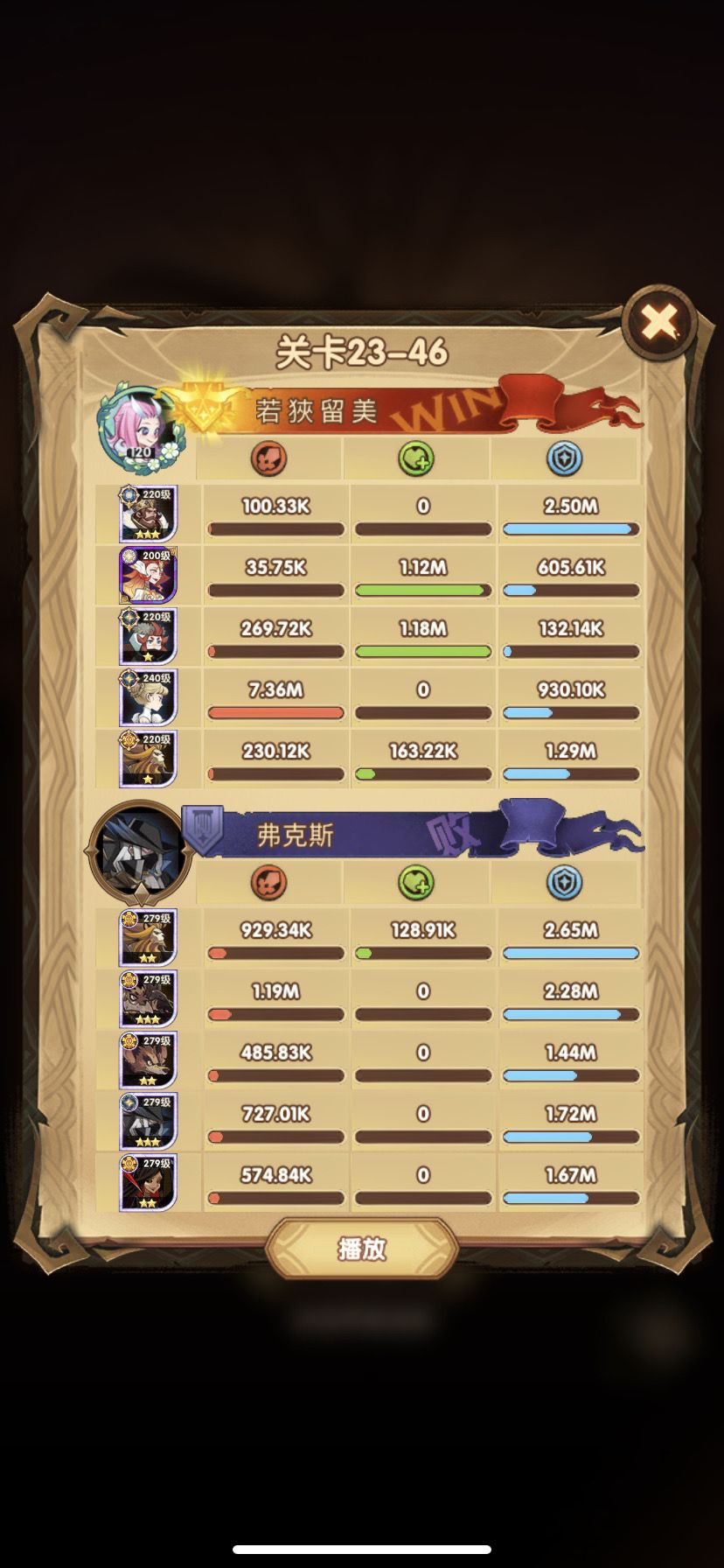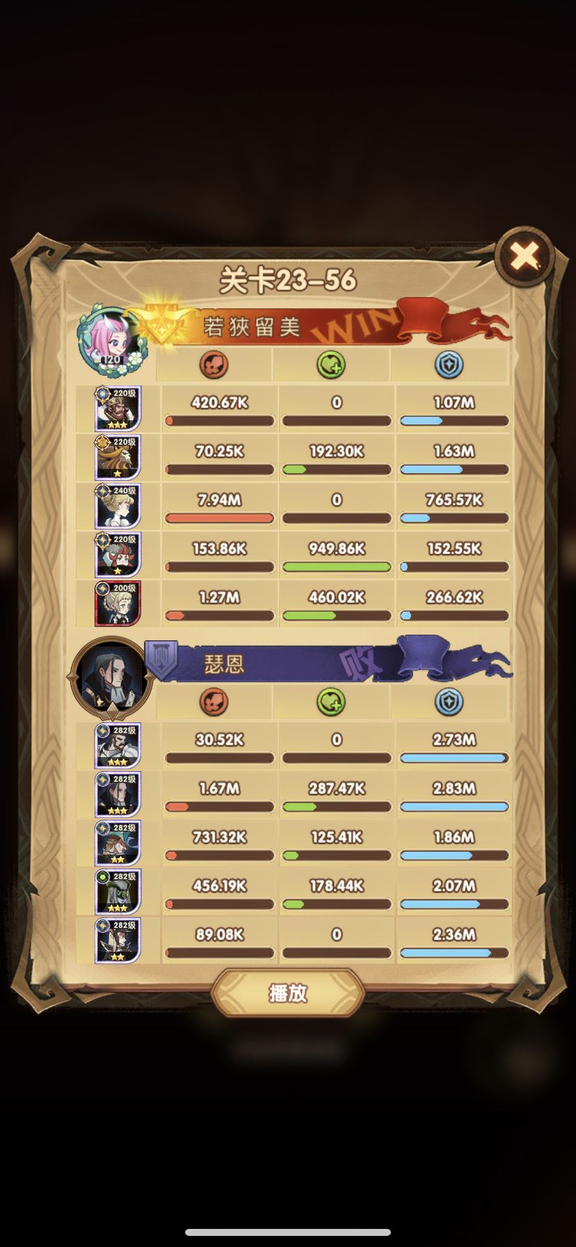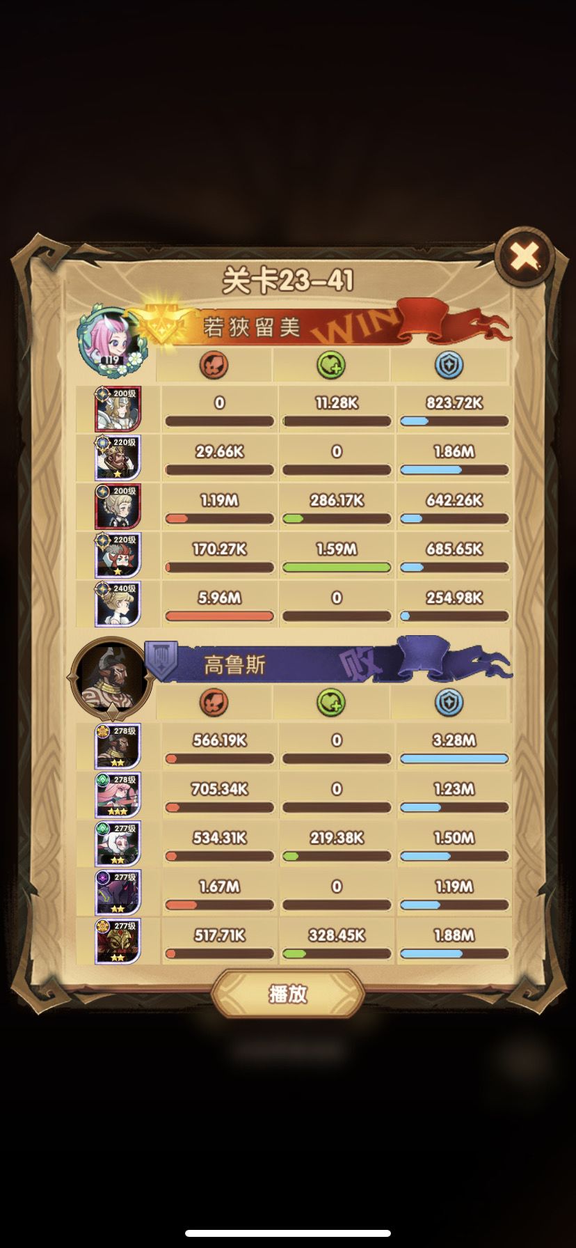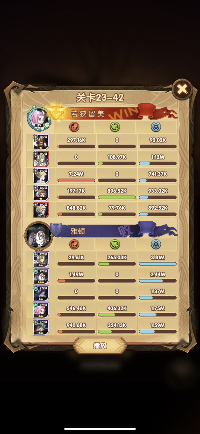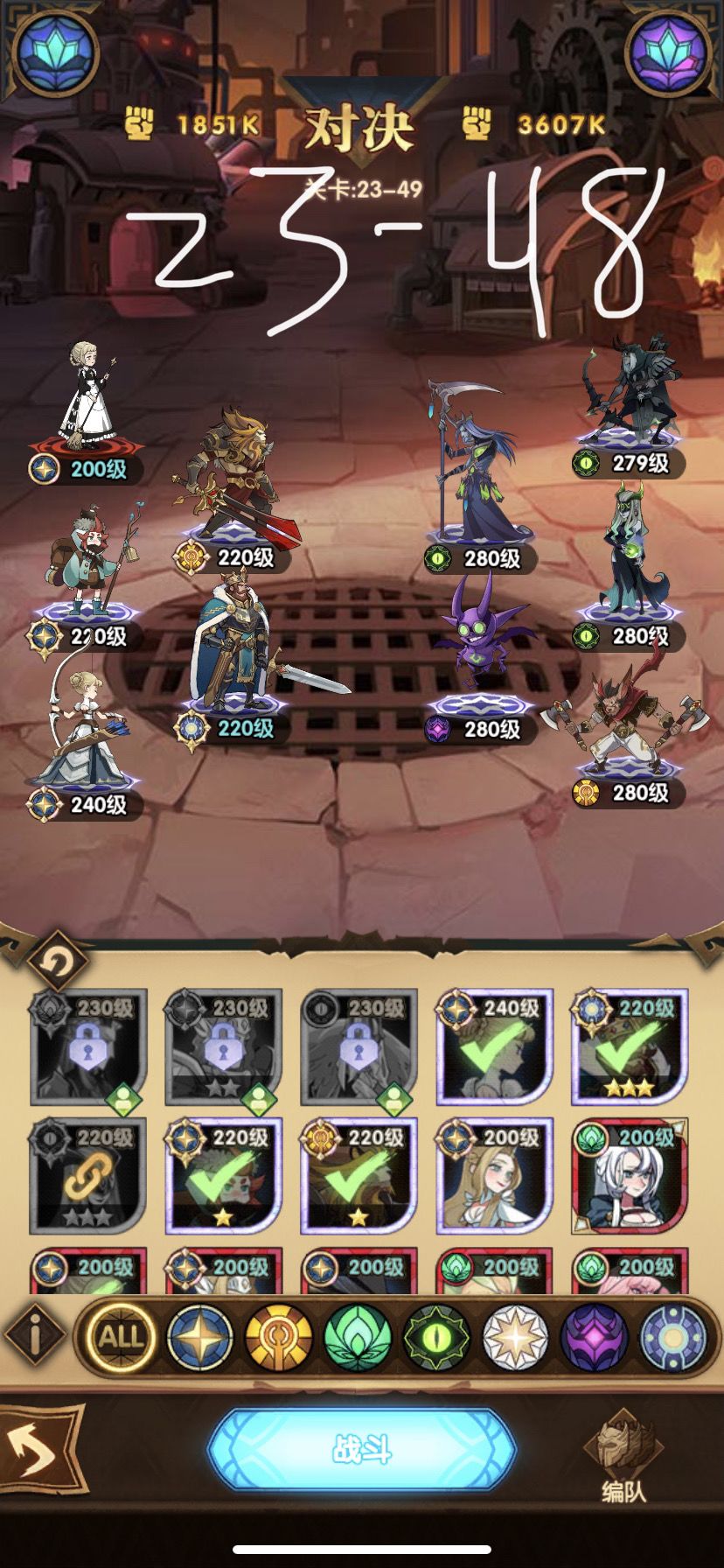 等级的话就是龙弓240+两个220+两个200,正常到23章应该都差不多是这个等级。亚瑟一开始绑的狮子🦁️,但是后来发现有些关没狮子扛不住,就绑了女妖。现在为了高阶竞技场能多挣几个币,改成了光女。