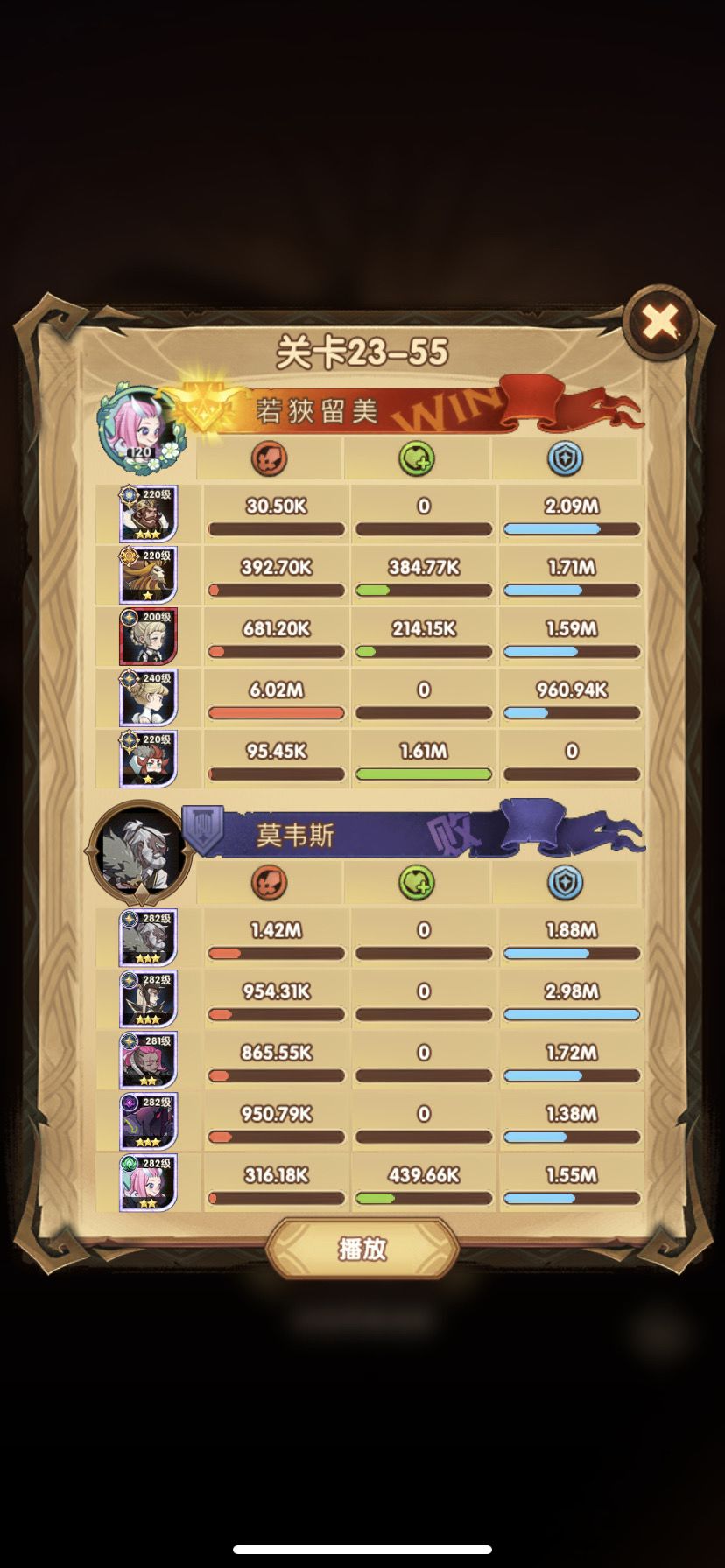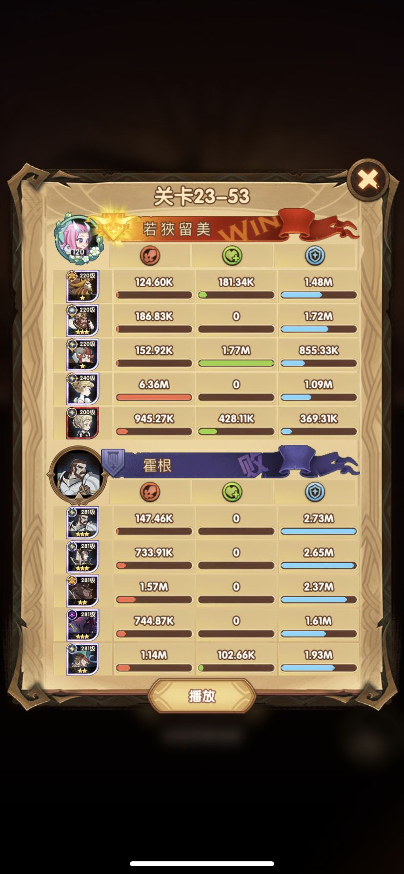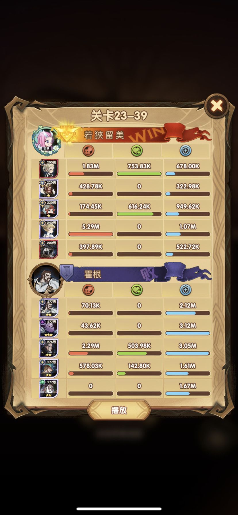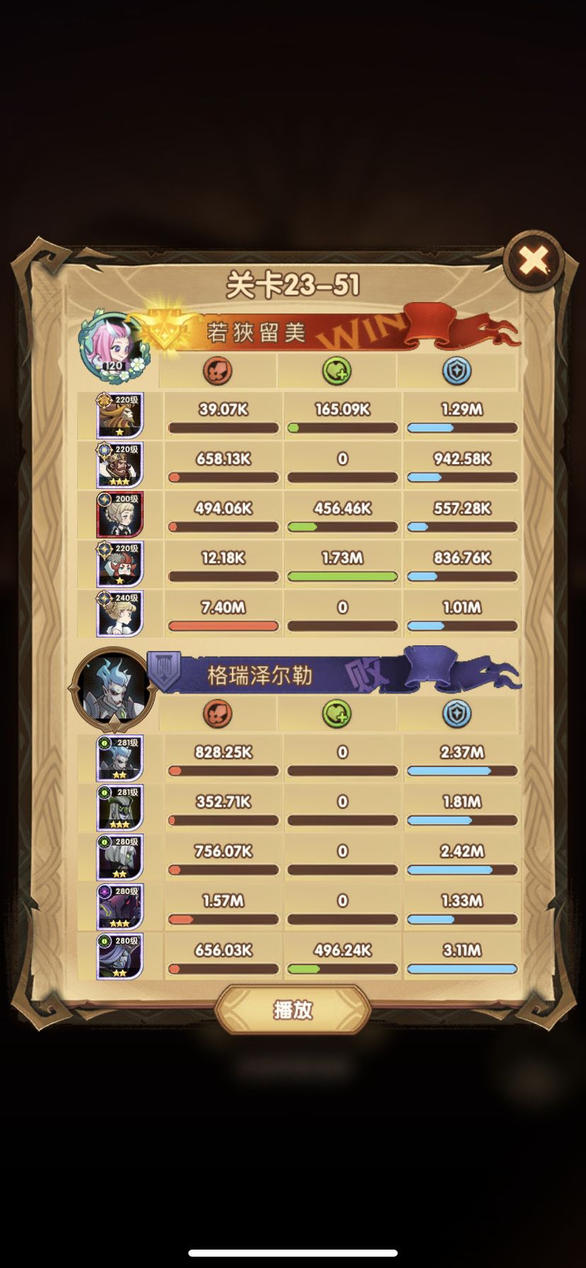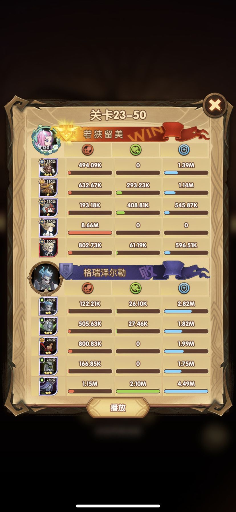 等级的话就是龙弓240+两个220+两个200,正常到23章应该都差不多是这个等级。亚瑟一开始绑的狮子🦁️,但是后来发现有些关没狮子扛不住,就绑了女妖。现在为了高阶竞技场能多挣几个币,改成了光女。