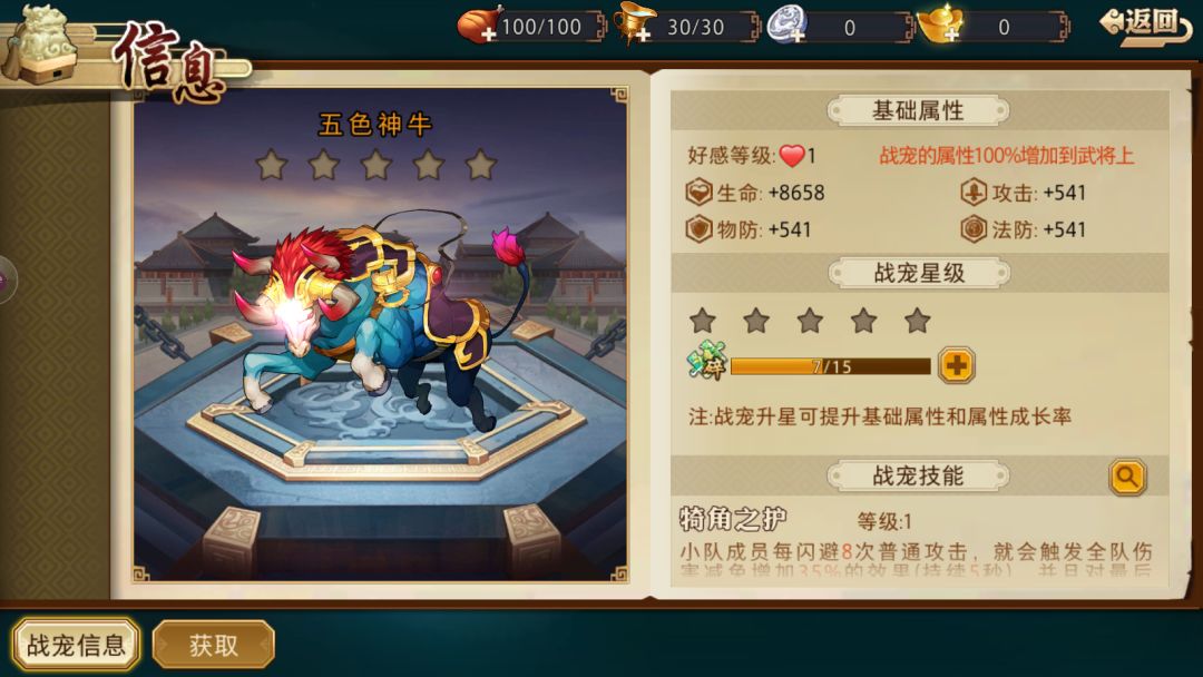 免伤让你绝望,五色神牛的技能是犄角之护,小队成员每闪避8次普通攻击,就会触发全队伤害减免增加35%的效果(持续5秒),并且对最后的攻击者造成相当于200%攻击力的无视防御的反伤,该效果每五秒最多触发一次。肉盾神器。