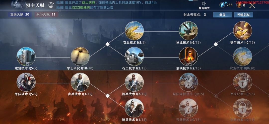 兵营在前期的作用除了利用资源快速清理叛军之外,就是对于军队的管理了,可以巧妙利用建筑生产余下的资源来升级技术,比如:谍报、征伐战略、骑士精神等等…天赋方面也是开发到满足军需就足够,一般只开发步兵战术和骑兵战术,如果另有别的兵种,也可以适当开发一下。