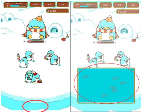 可以通过点击下方海水,来获得各种小鱼,用于提高大企鹅的