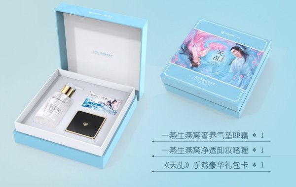 《天乩》手游联合一燕生推出定制版一燕生轻妆礼盒,内含气垫BB霜、卸妆啫喱等丰富产品。礼盒现已上线销售,专属游戏豪华大礼包随礼盒超值赠送!