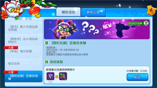 4月20日-4月26日,巨狼杂货铺再次更新店铺商品,即刻起使用部落徽记能够在活动期间现实兑换宠物妈咪熊与吃瓜群众碎片,技能龙卷风、勾斧与英勇一跃碎片,同时也可选择兑换消耗物品烤鸡和迷幻菇。