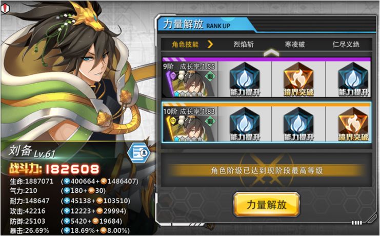 刘备的天赋技能使这一角色具有超高的生存能力,非常适合玩家进行日常升级,是完成关卡的第一人选。