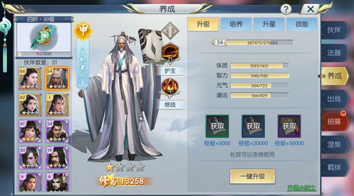 甲级同伴中对青曜十三司来说增益最大的就要数天机老人了,天机老人护主技能的效果是增加主角的生命值,提高青曜十三司在团战中的生存能力。但是天机老人的绝技技能神石天书才是对青曜十三司增益最大的,神石天书的1级释放效果是为队友回复5次生命,每次100%的基础攻击+2000点生命值。这里的生命回复是对队伍的团队血量回复,对于青曜十三司来说就相当于多了一个生命回复的技能,在对团队的生命回复上显得更加的游刃有余。