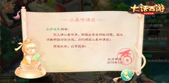 在此次的活动中,大话一共设置了六个奖项,每个奖项都和大家在学校时的生活息息相关。这些奖项分别是认真听课奖、勤奋好学奖、身经百考奖、助人为乐奖、拾金不昧奖和降妖除魔奖,每个奖项获取的方式各不相同,完成指定任务才能够获得奖状。例如活动期间,参与文曲星活动,回答老师的课堂提问,累计回答正确的次数就能获得认真听课奖状;玩家通过带队等方式可获得好心值,累积好心值即可解锁助人为乐奖状奖励等等。