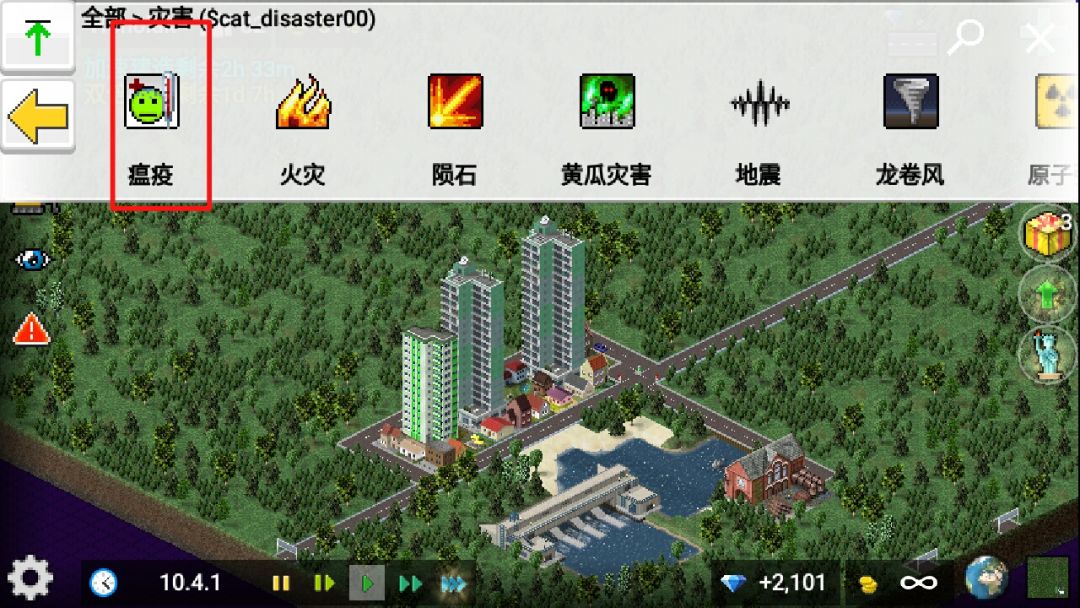 灾难当中增加了瘟疫病毒。怎么使用呢?点击那个图标。点击确认,随便点击一个有人的房子。怎么消除它呢?叫救护车。点击距离那个房子最近的道路一会就清除掉了。这个瘟疫病毒会扩散的。要把它全部清除干净才好。一个都不能留。