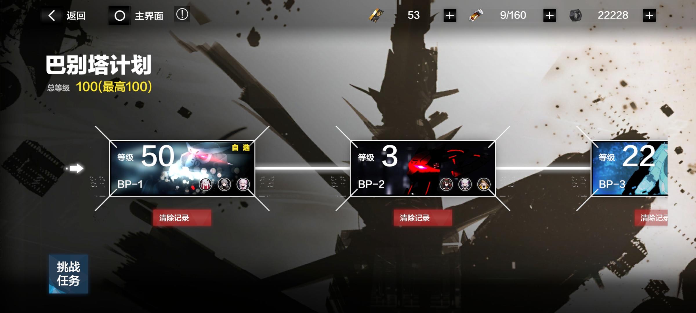 我主要练了白毛,比安卡,烬燃三个C,还有丽芙*3,铁憨憨,70,红莲,黎明,这些之前为打黄金准备的只升了级的咸鱼,首先用主C莽到自选难度后清记录,打下一关,一路莽通关后再重新打1,3,5自选难度。