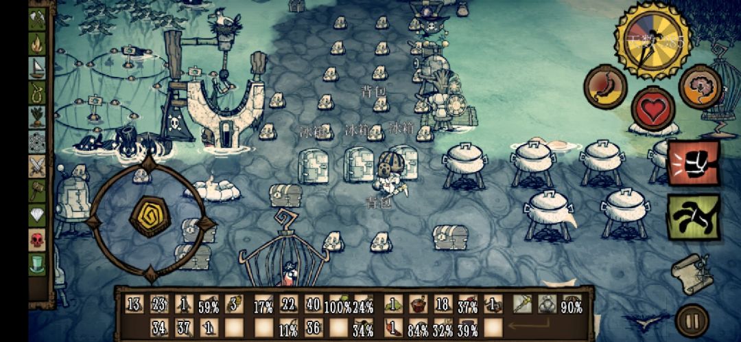 如图,在屏幕的右方,有着很多的图标,右上角是表示昼夜更替的时间表,通过它你还可以看到自己生存的天数。