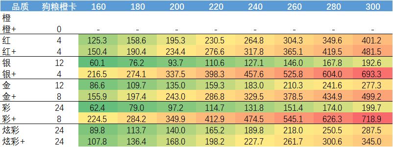 ② 表中数据的含义是“将某一级别的英雄,从品质A-1晋升到品质A,平均每张狗粮橙卡带来的属性基准值的提升”。例如,表中右下角的“345.0”含义为:将一张300级炫彩的英雄晋升为炫彩+,会消耗24张狗粮橙卡,平均每张橙卡提升了345.0点属性。