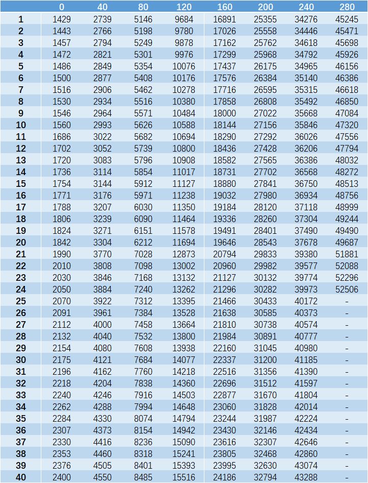 ① 表格中每一列的标题为该列的起始等级,之下来的40行分别为相对于这个起始等级的偏移值;使用时将行标题与列标题相加即为对应等级。例如,表格左下方的数据“2400”代表的就是炫彩+英雄0+40=40级时的属性基准值。