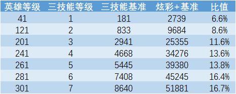 #表3:不同等级下,三技能基准值与炫彩+英雄属性基准值的对比