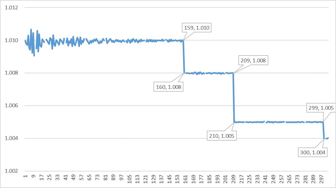 从表3中可以看到,随着三技能等级的提升,表中的比值逐渐增大,即相比于炫彩英雄的基本属性的提升更大(大概是策划考虑到英雄等级低的时候品质也不会高)。下面是一个更具体的图: