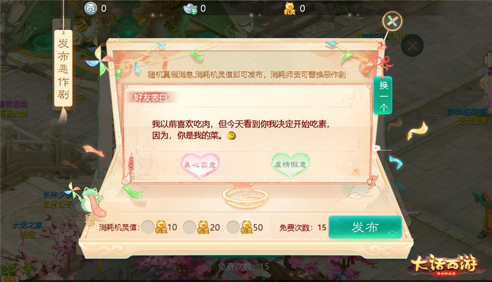 作为愚人节里的经典整蛊环节,定少不了“真假表白”这么有趣的活动!玩家在活动期间消耗机灵值生成表白,勾选“真心诚意”或“虚情假意”后即可发送给好友!究竟是真心表白,还是戏弄好友,大家可不要错过这个表达心意的特殊方式哦!说不定戏言也成真,一段良缘等着你!