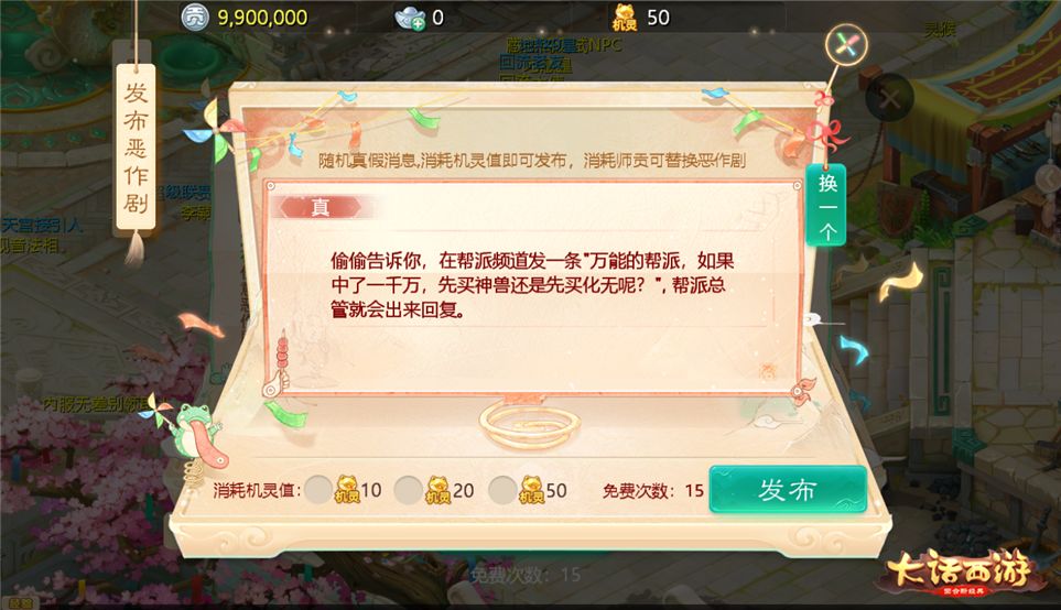 每位玩家每天可以免费发布15条恶作剧,之后想要再发布恶作剧,就需要额外消耗银两10w/条,最多额外可以再发布15条恶作剧。每次消耗10w师门贡献还可以刷新恶作剧的种类,玩家可以选择在帮派、世界频道发布或者是对自己的好友发布恶作剧。