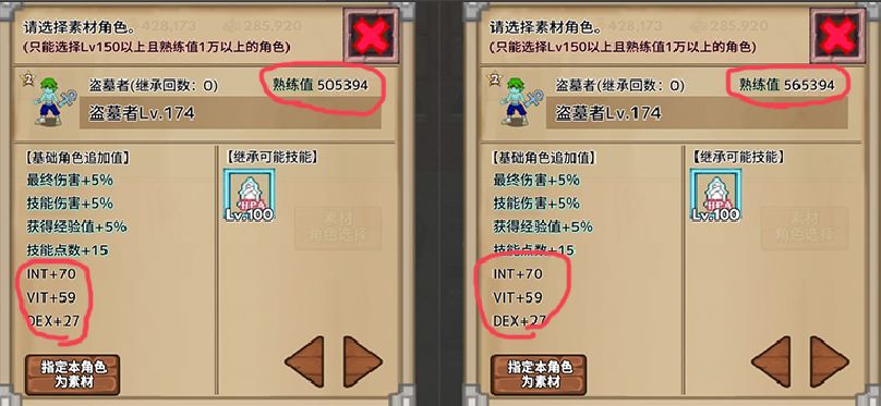 继承的属性根据素材角色自身的职业决定,比如我这位盗墓者能够给角色A提供INT VIT DEX的加成,其他的职业也会提升各自不同的属性。