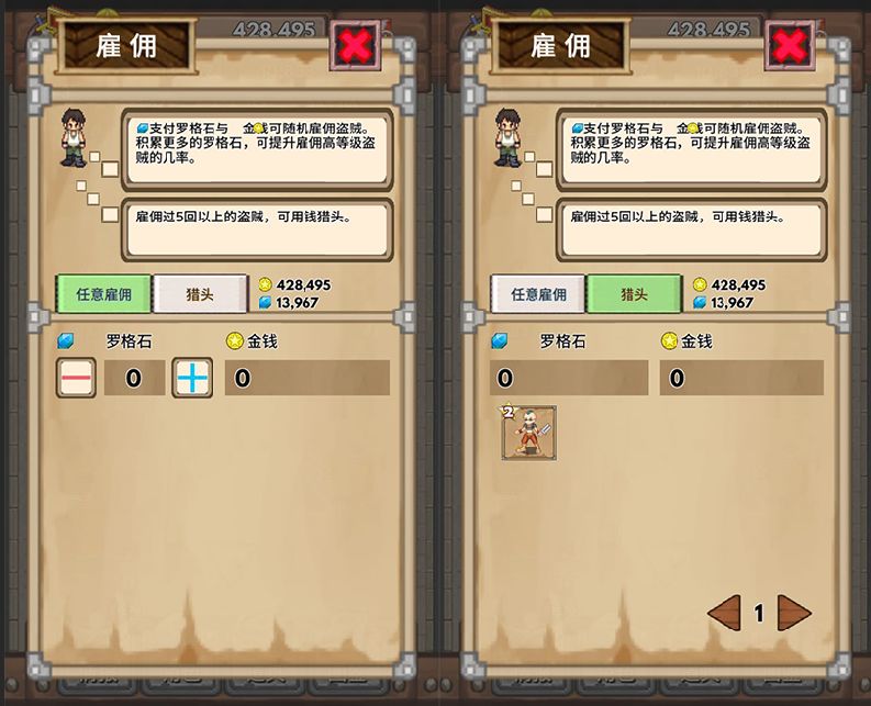在闯关和重置关卡的过程中,我们可以获得蓝色的宝石“罗格石”,使用罗格石与金币可以在罗格斯商会雇佣角色。雇佣的角色从1星级到10星级角色,星级越高的角色基础属性更强,自带的技能也越多,但与之相对的是升级经验也需要的更多。