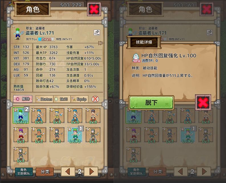 这位盗墓者最亮点的属性是源自于其被动技能“HP自然回复强化”,当被动技能到达100级时,能给我们提供100多点的秒回。这个HP自然恢复的面板只受装备与被动技能的加成,想要不靠技能单靠装备来获得提升在前期还是相当的困难的。