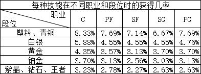 每个职业的铂金段位各新增一个技能。每种技能在不同职业不同段位时的获取几率如下: