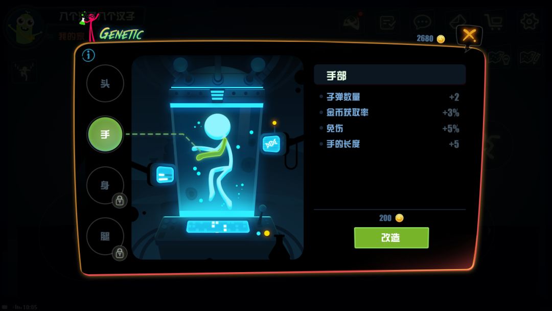 而首次登场的基因系统,则给予火柴君们一个改造火柴人的机会,玩家可以选择强化手脚力量,或者装载更多子弹,火柴人虽小,体内却蕴涵无穷的能量!