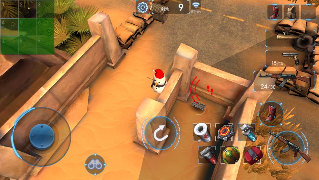 a. 我所在的位置(雪人的位置,没错这个图不应该有雪人的)旁边出现了红色的脚印👣标记,这表明对应方向(图里是右边)有人经过,但是小地图没有小红点,表明我这里看不到他(被墙挡住了),我选择继续苟(:з っ )っ