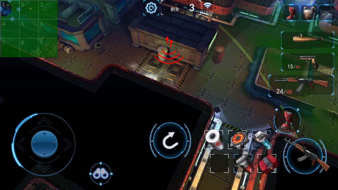 上图左上角可以看到九宫格地图的小地图,每个小地图左上角有编号,并且有四个蓝色的圈表示可以通往邻近地图,绿色点(我是在6号图下方出入口)表示自己所处的位置。