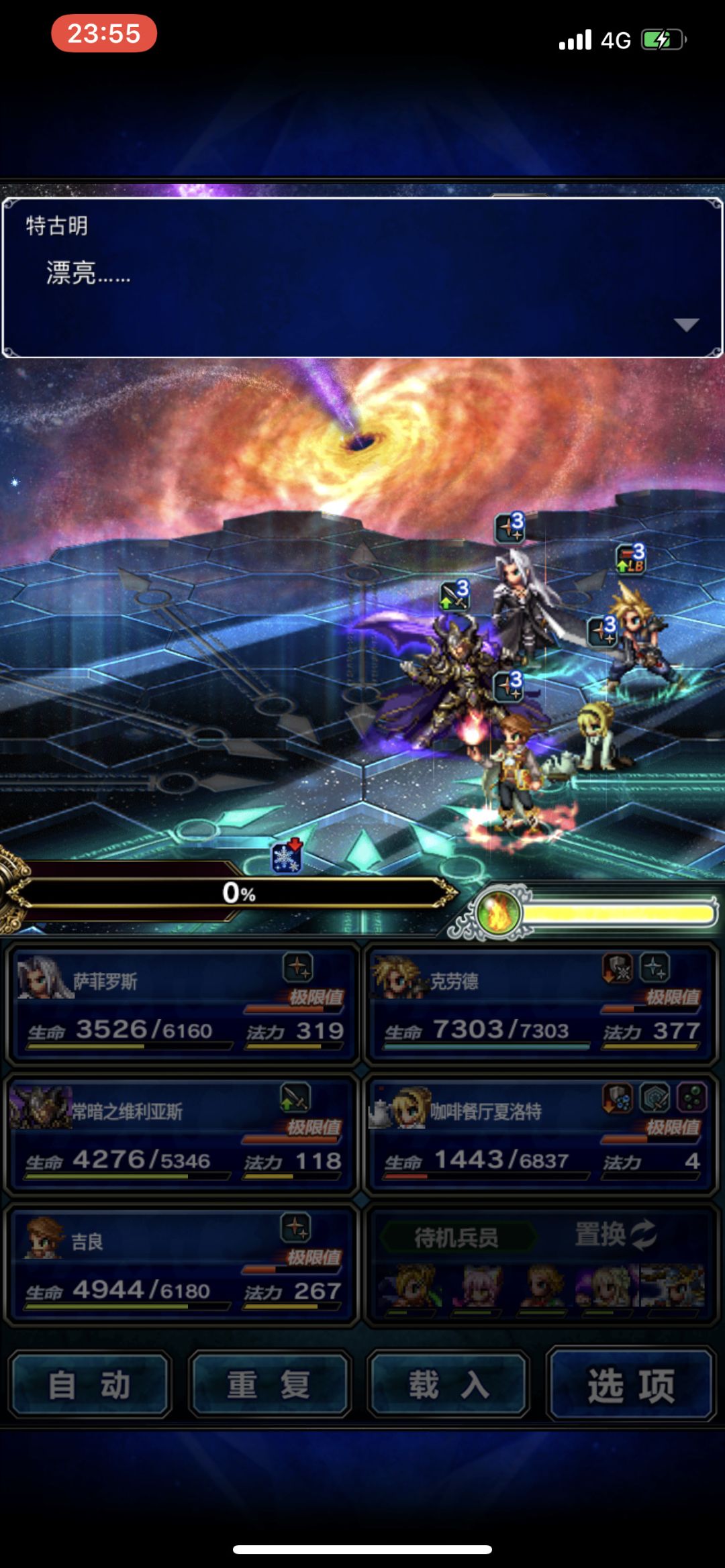 二阶段进去就会先倒人,进阶段这一轮战斗记得光战群坦,治疗预复活全体【前面每回合2个】 进去之后除了开场倒人依旧不难,开始磨血,boss到39%血量进三阶段,可以说这个boss整场战斗就是为了这个阶段,前面都是铺垫【三阶段boss每轮都让你团灭,所以最多打2-3轮】进39%阶段这一轮白菲lb全体预复活,开始一轮物理叠c,基本这轮能把boss打到27%的样子【记得下白菲上硫克继续预复活lb】27%可以说是最后一波了,加攻buff开启,叠c继续,克劳德终结。