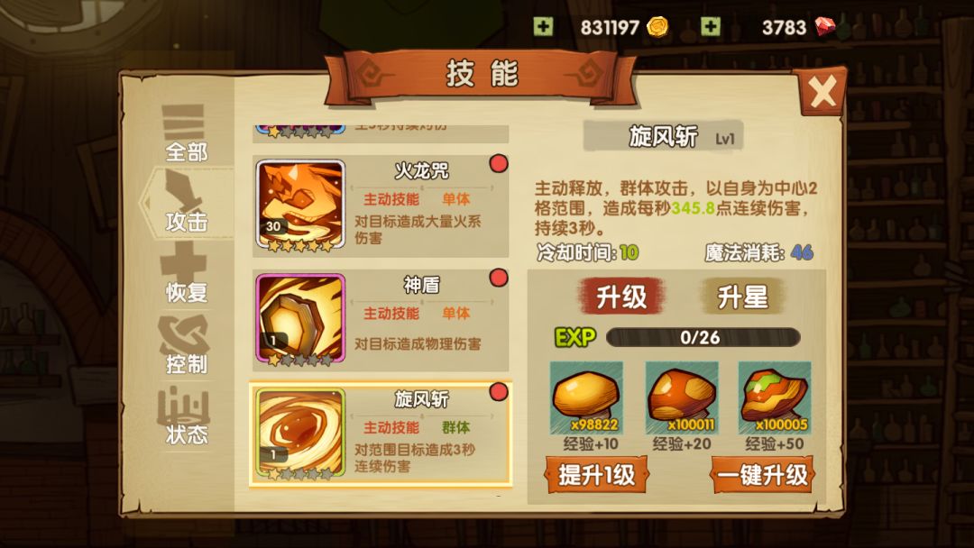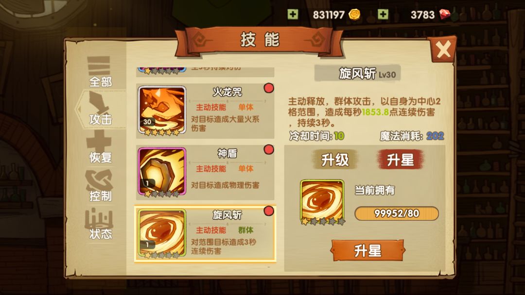 升星则需要消耗技能碎片,关卡里打怪爆出,通关关卡也会有碎片奖励。