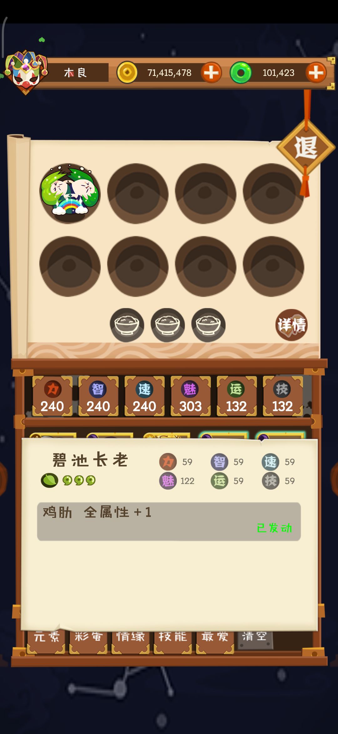 每上场一个彩蛋妖怪,麻单自身智力x135%,运气x155%技巧x168%
