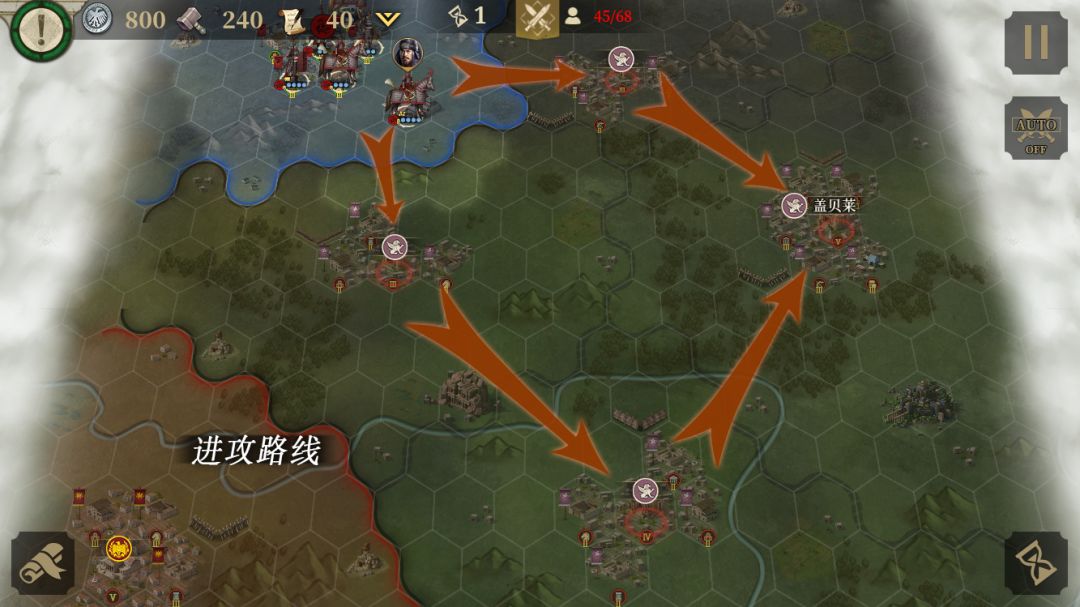 本关目标是消灭所有敌对国家,击败40支敌军部队,16回合内达成目标。本关只要占领所有敌方城市即可达成主目标。埃克巴坦纳和泰西封是5级城,优先占领,补充兵力,然后按图示路线进攻其他城市。黄圈是2张优势卷轴。