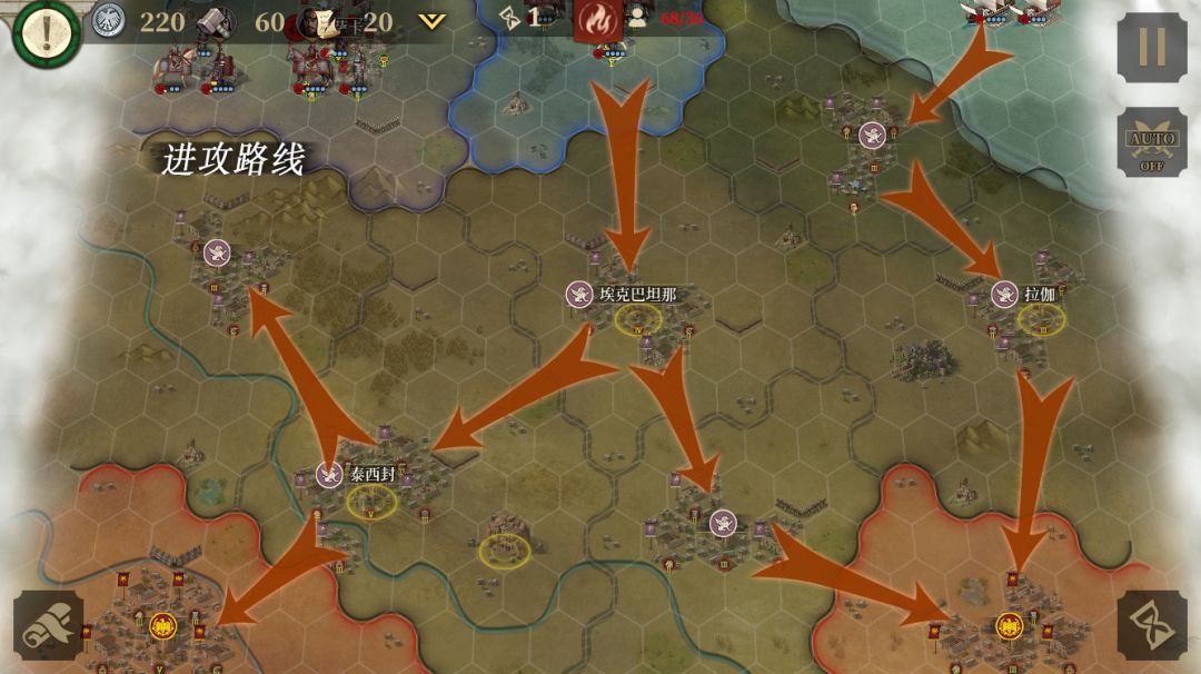 本关目标是消灭所有敌对国家,击败40支敌军部队,16回合内达成目标。本关只要占领所有敌方城市即可达成主目标。埃克巴坦纳和泰西封是5级城,优先占领,补充兵力,然后按图示路线进攻其他城市。黄圈是2张优势卷轴。