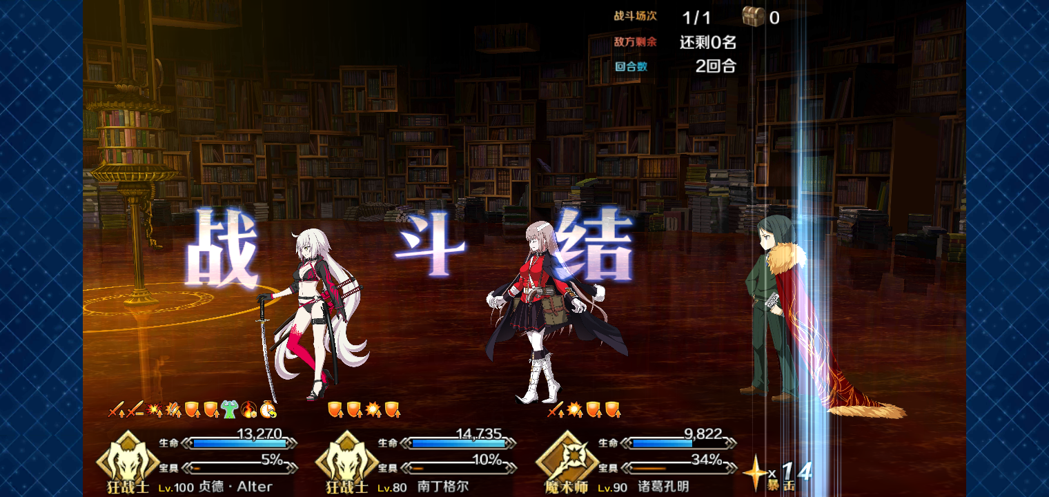 这次配置比较亲民,只要嫖个大佬的高练度狂贞就行,狂阶没有集星真的难受啊,50%暴击率我变更了6次时间线才成功,