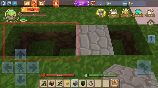 左边的坑是用来放水的,右边的坑是用来放岩浆,划重点:左边的坑第2个格子向下挖2块土地,这样会形成一个阶梯,水会向下流动!