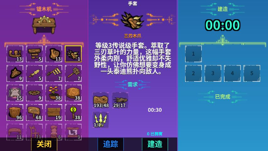 它是游戏中出现的第一个橙色级装备,是等级三的手套。我们可以看到它的配方中,木头和锯齿草叶这两项资源是非常容易获得的。但构成这个装备最主要的还是第三个资源,三刃草叶(其实我忘了叫啥)