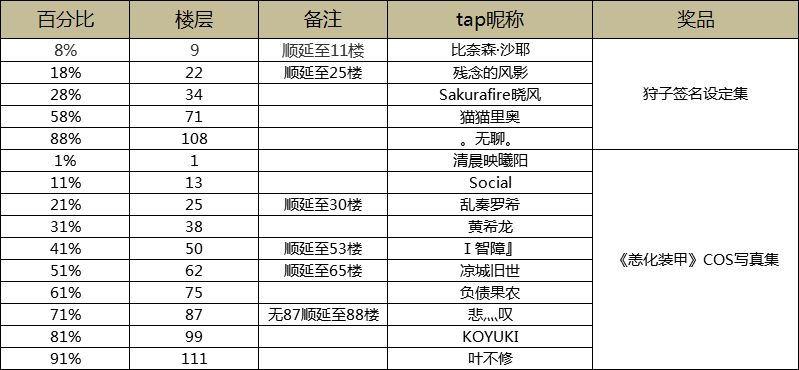 2. 活动结束后一周内,总楼层的1%、11%、21%、31%、41%、51%、61%、71%、81%、91%将获得《恙化装甲》cos写真集一本